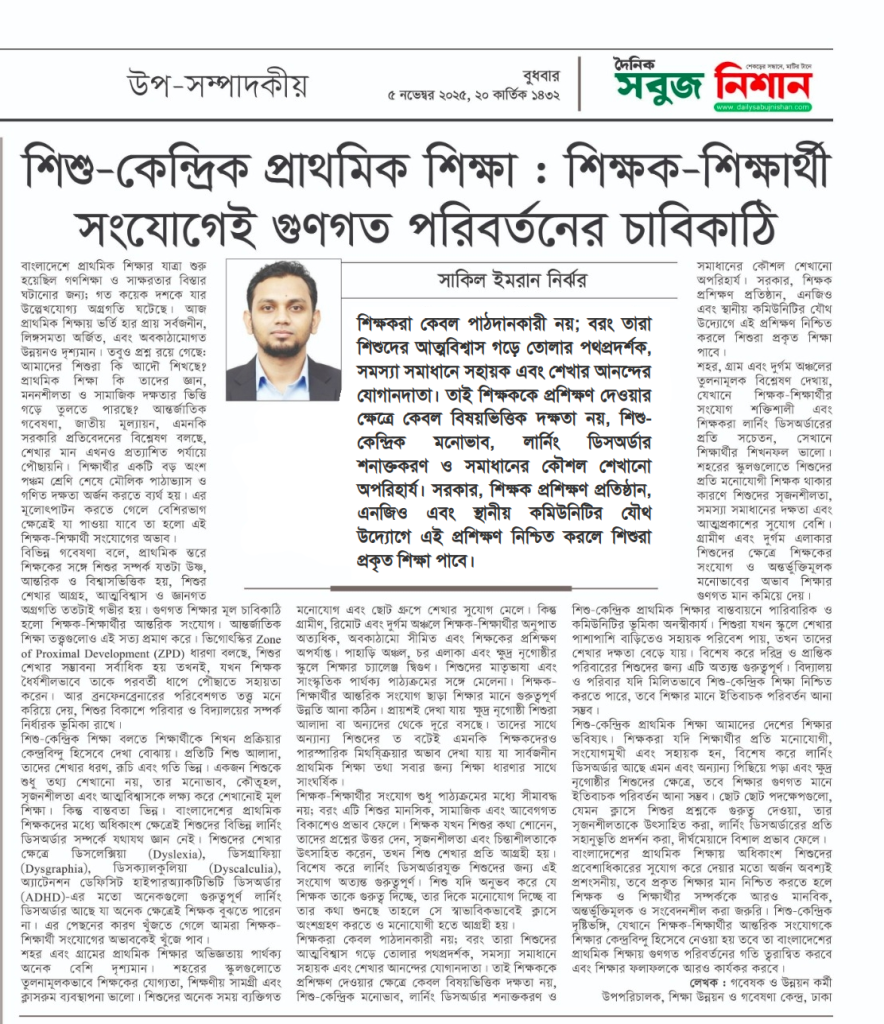 My Article Published In a Daily Newspaper Focuses on ”শিশু-কেন্দ্রিক প্রাথমিক শিক্ষা: শিক্ষক-শিক্ষার্থী সংযোগেই গুণগত পরিবর্তনের চাবিকাঠি” (05 November, 2025)